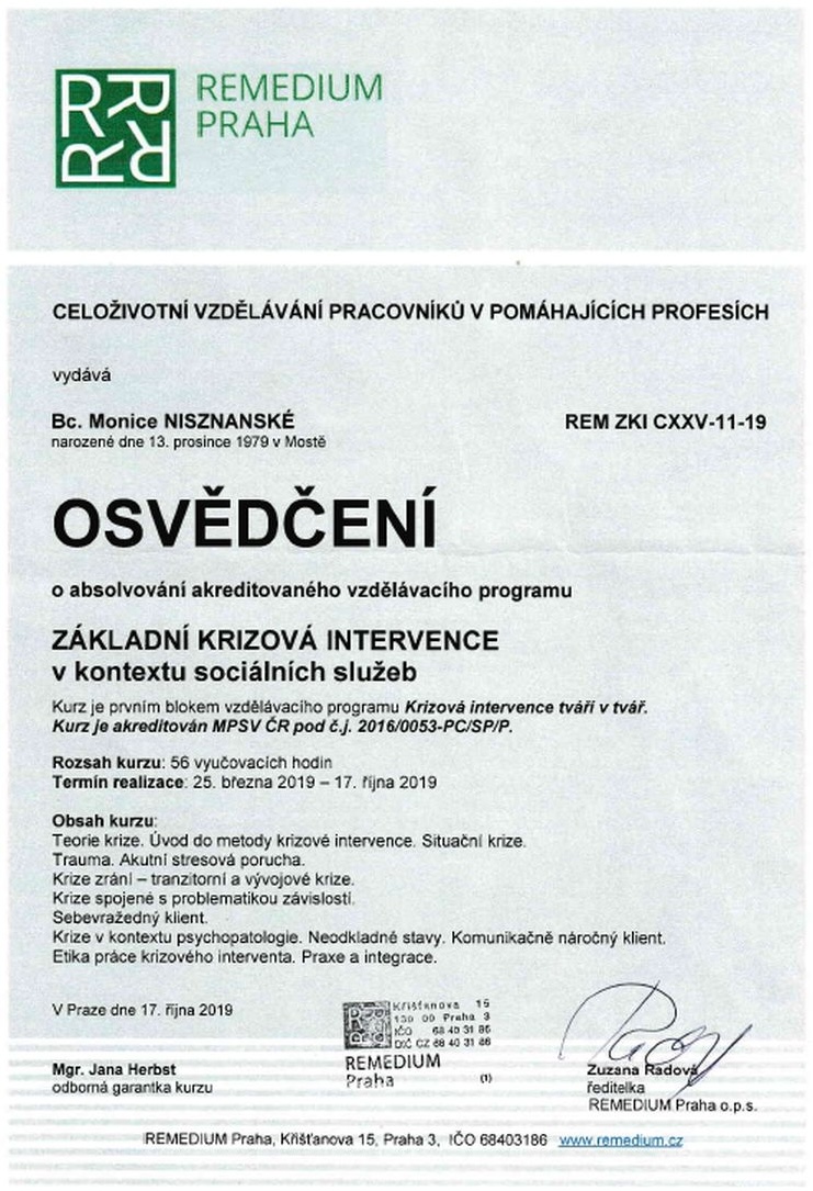 - Remedium: Kurz základní KRIZOVÁ INTERVENCE(2019)