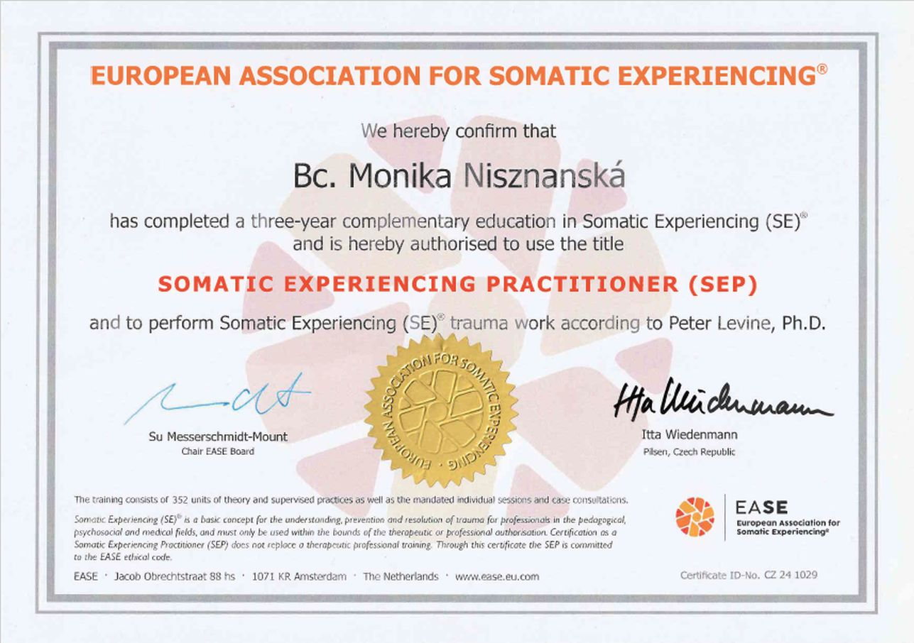 Už teď vám krásně dokážu díky vůním éterických olejů pomoci při zmírnění nepříjemných psychických i fyzických stavů. Nedalo mi to, a rozhodla jsem se naučit se používat vonné oleje profesionálně. Náš nos prostě neokecáme. - Výcvik SOMATIC EXPERIENCING(2021 - 2024)